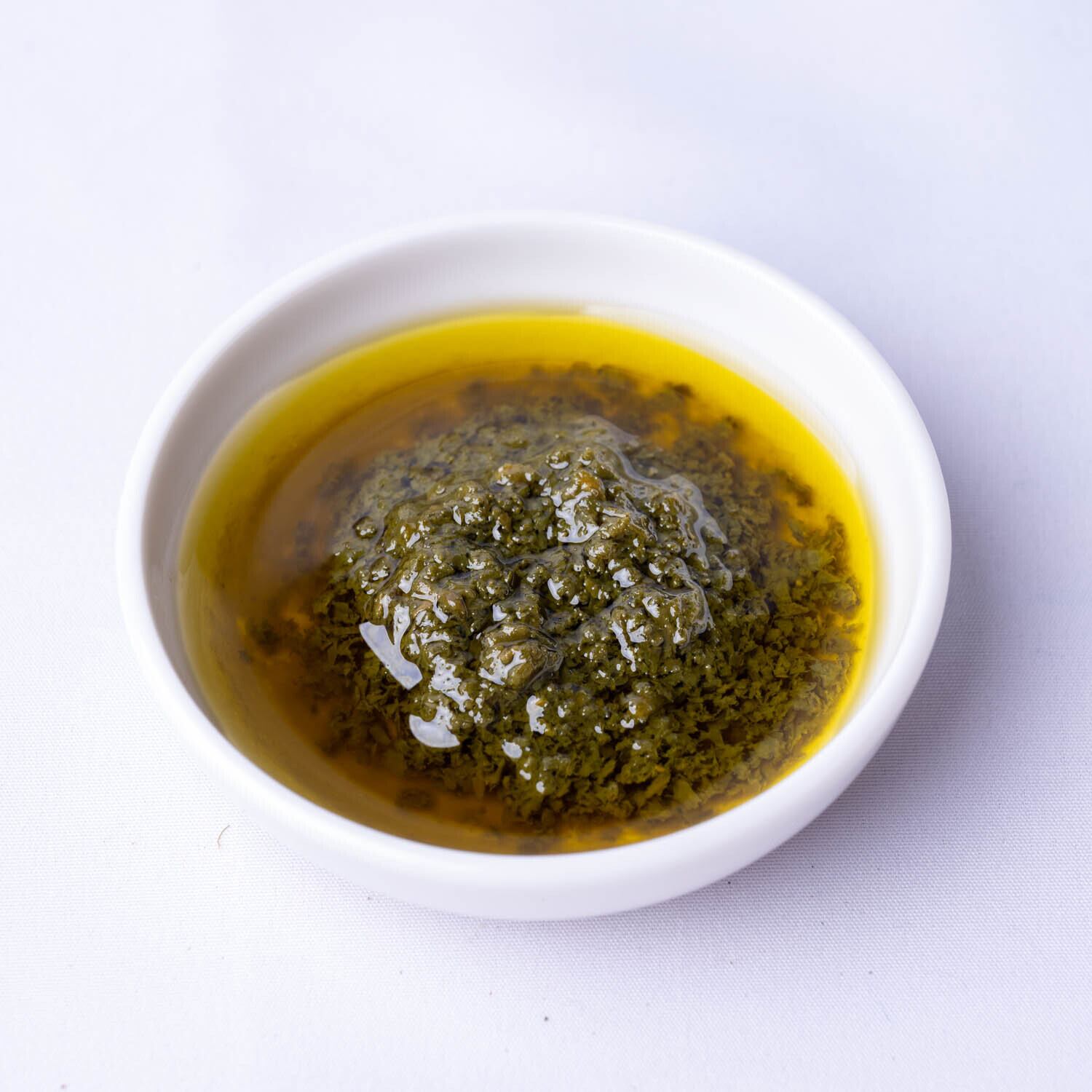 収穫したてのフレッシュバジルの爽やかな香りと風味をはじめ、ニンニクの豊かなコク、オリーブオイルの果実香。ここに隠岐の藻塩を加えて味を膨らませた、フランスと隠岐の魅力が溶け込んだソースです。