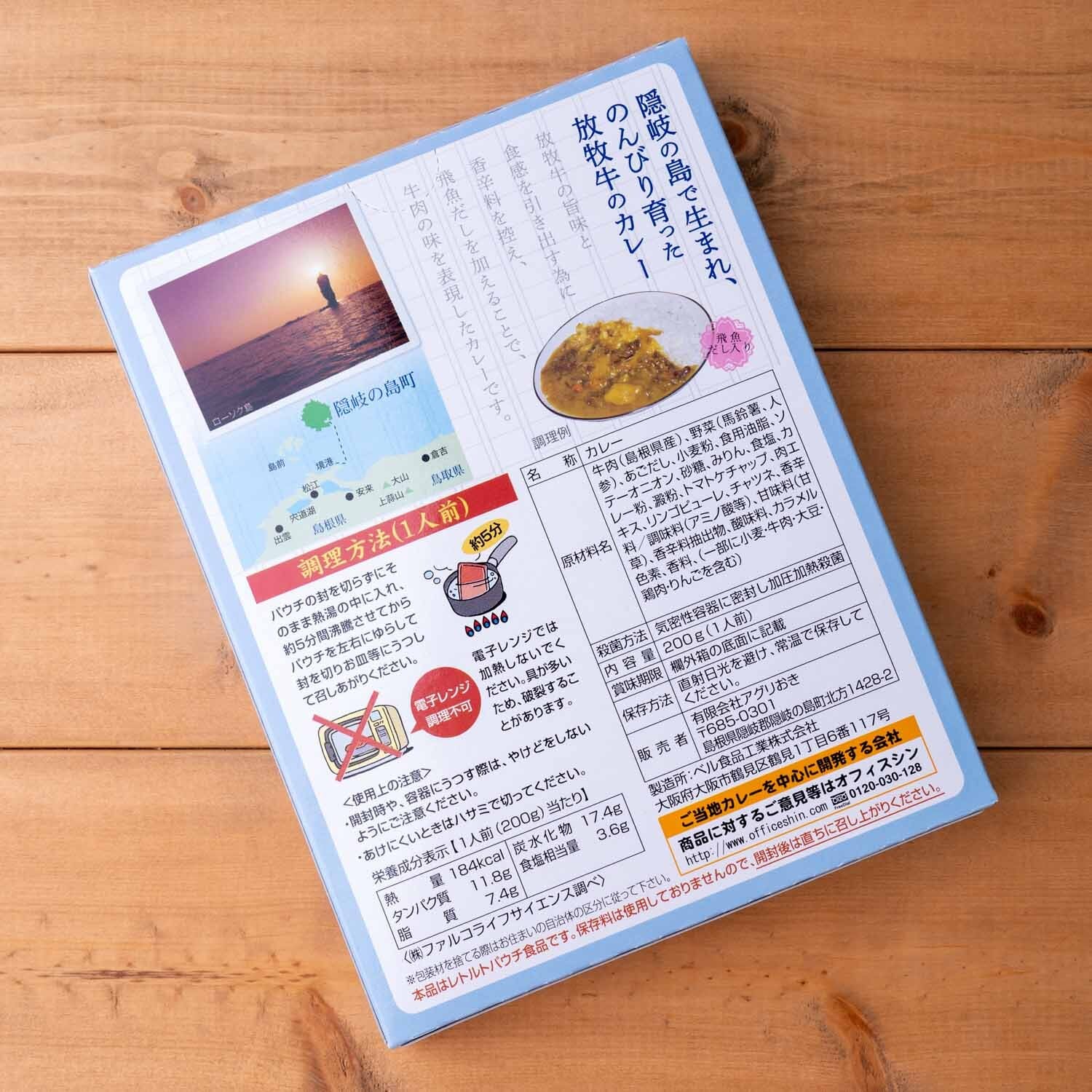 原材料名:牛肉(島根県産)、野菜(馬鈴薯、人参)、あごだし、小麦粉、食用油脂、ソテーオニオン、砂糖、みりん、食塩、カレー粉、澱粉、トマトケチャップ、肉エキス、リンゴピューレ、チャツネ、香辛料/調味料(アミノ酸等)、甘味料(甘草)、香辛料抽出物、酸味料、カラメル色素、香料、(一部に小麦・牛肉・大豆・鶏肉・りんごを含む)
