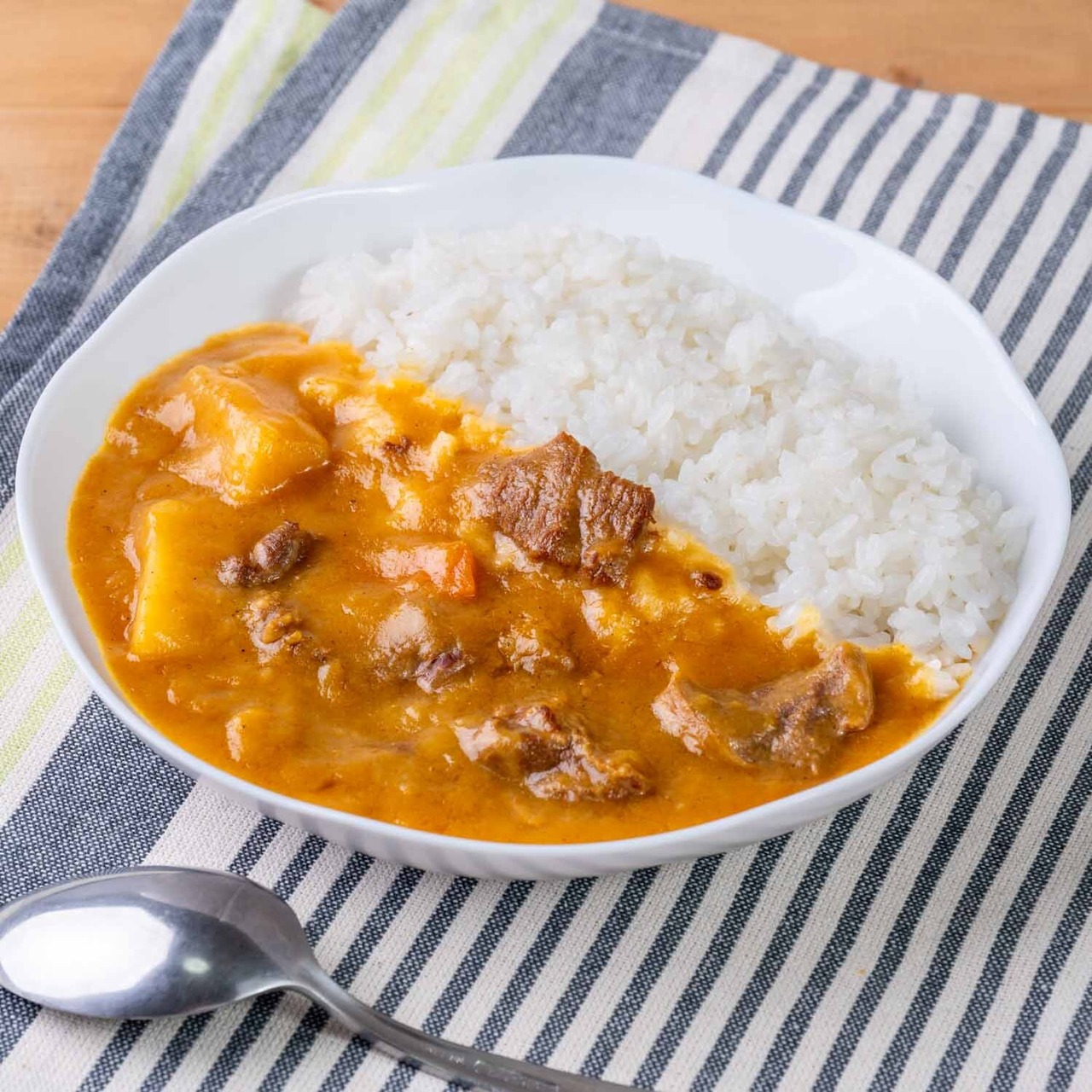 ソースの旨味と香辛料の心地よい刺激が後を引く、食べ応えのあるリッチなビーフカレーです。